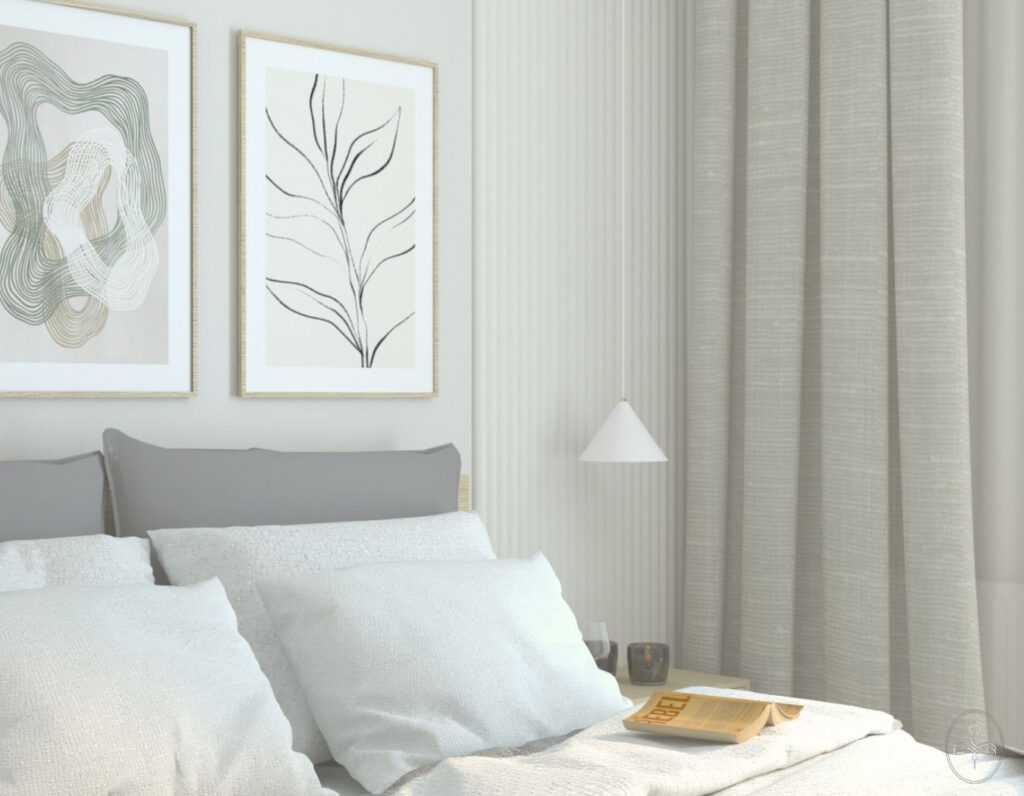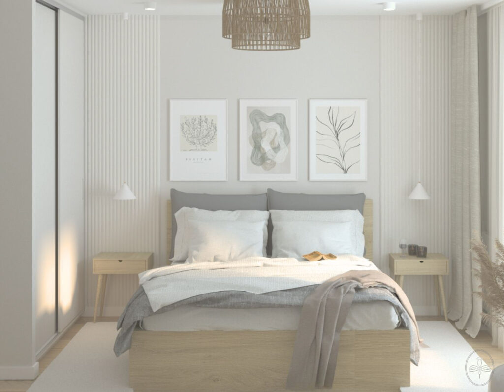 Sypialnia w spokojnej kolorystyce udekorowana subtelnymi panelami dekoracyjnymi.