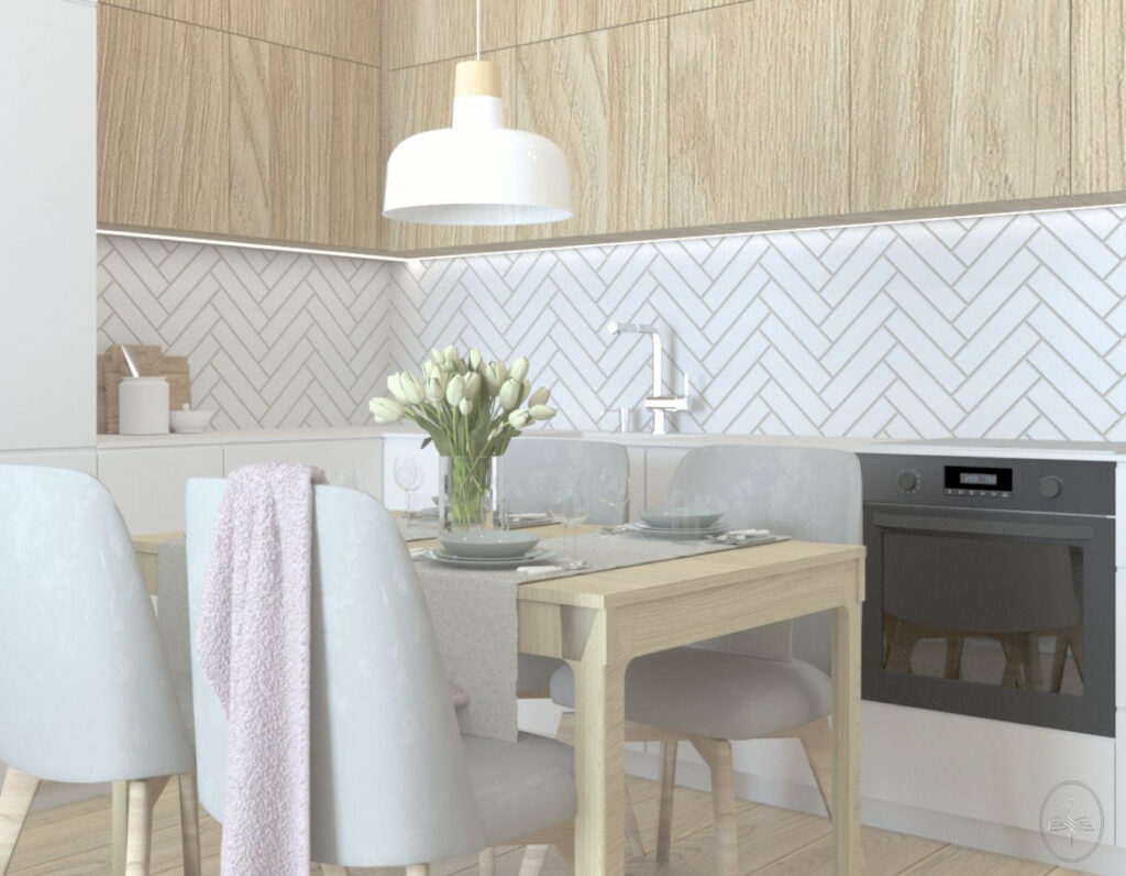Funkcjonalna kuchnia wyróżnia się głównym elementem dekoracyjnym – małymi, podłużnymi płytkami ułożonymi