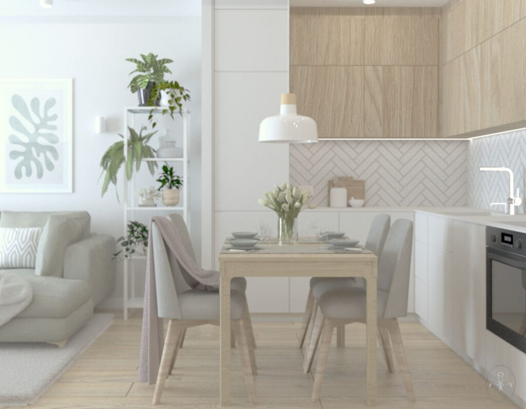 Mieszkanie zostało zaprojektowane z myślą o młodym małżeństwie, dla którego kluczowe były funkcjonalne rozwiązania takie jak otwarta kuchnia, rozkładany stół do spotkań z przyjaciółmi oraz komfortowy narożnik, na którym zmieści się kilka osób.