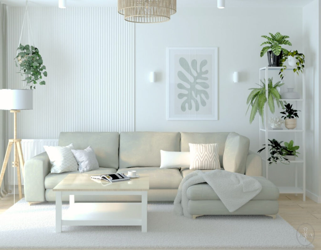 Przytulny salon z wygodnym narożnikiem, roślinami doniczkowymi oraz delikatną sztukaterią ścienną.